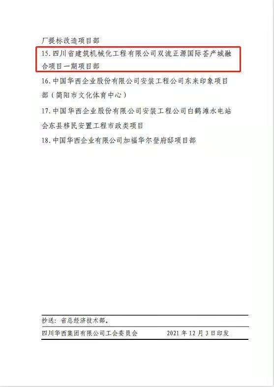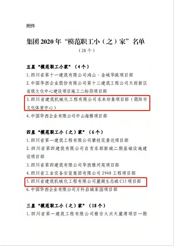 近日,集團傳來喜訊,經過評比驗收,集團工會決定授予四川機司東來印象項目部(簡陽市文化體育中心)“工人先鋒號”金獎、五星“模范職工小家”稱號;授予麓湖生態城C15項目部“工人先鋒號”銀獎、四星“模范職工小家”稱號;授予雙流正源國際薈產城融合項目一期項目部“工人先鋒號”銅獎、三星“模范職工小家”稱號。